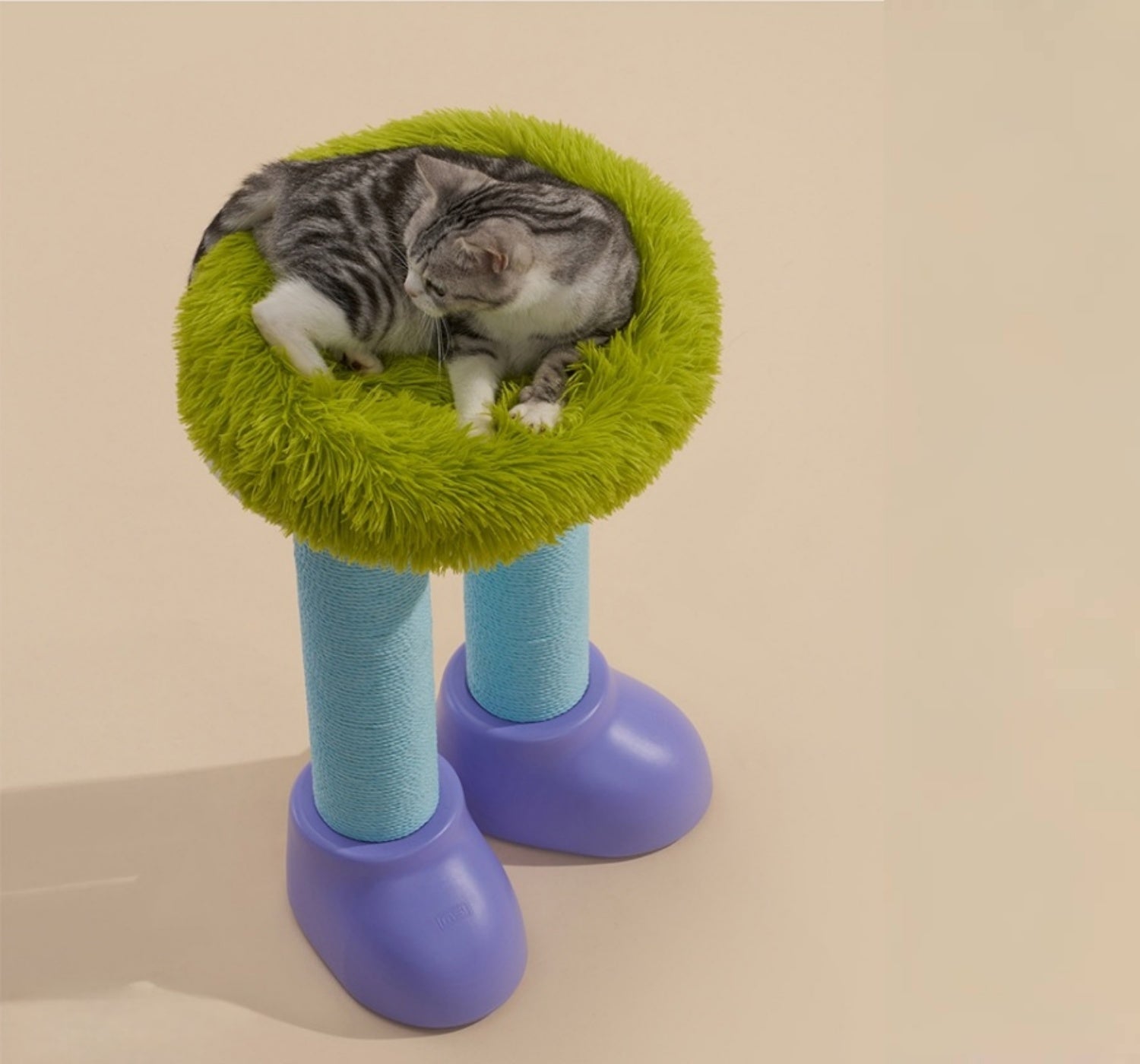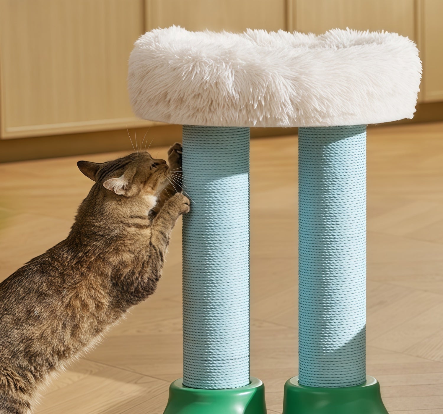 Paper-rope surface grips claws without prickles; plush nest keeps cats cozy after play.