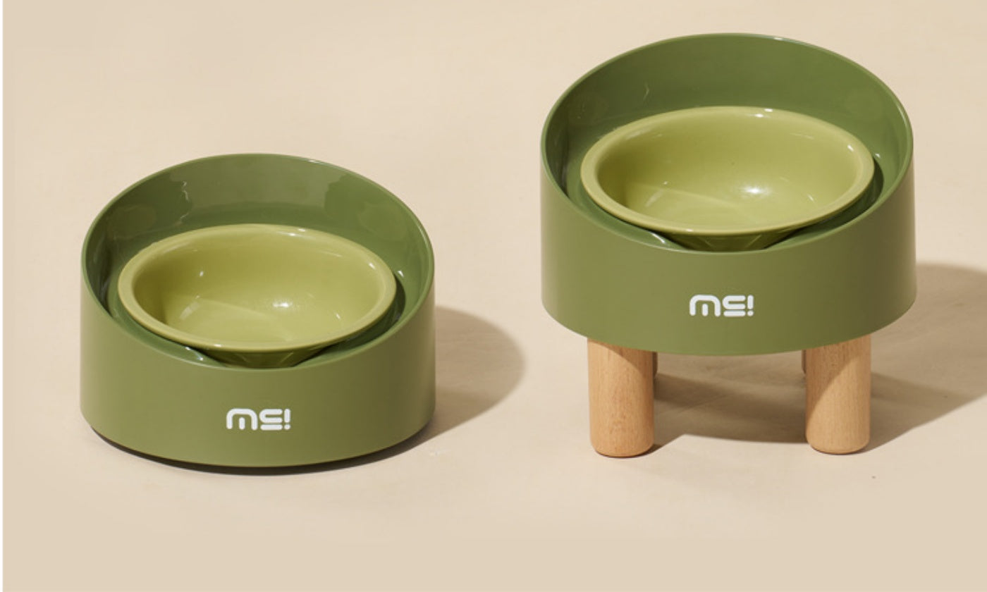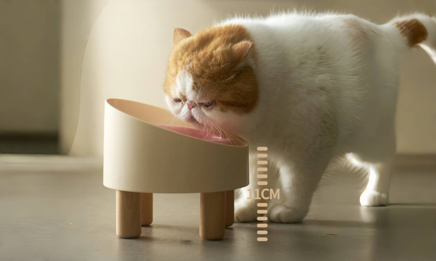 Introducing our anti-spill high-footed slanted pet bowl for cats and small to medium dogs. The 11 cm elevated, 8° slanted design protects necks, while the ceramic surface prevents black chins. A 4 cm raised rim and 2.5 cm anti-leak edge reduce mess and recycle overflow, keeping feeding areas dry. Adjustable wooden feet add a stylish furniture-like touch, and the 13 cm wide opening holds about 220 g of dry food or 270 ml of water for easy, comfortable dining.