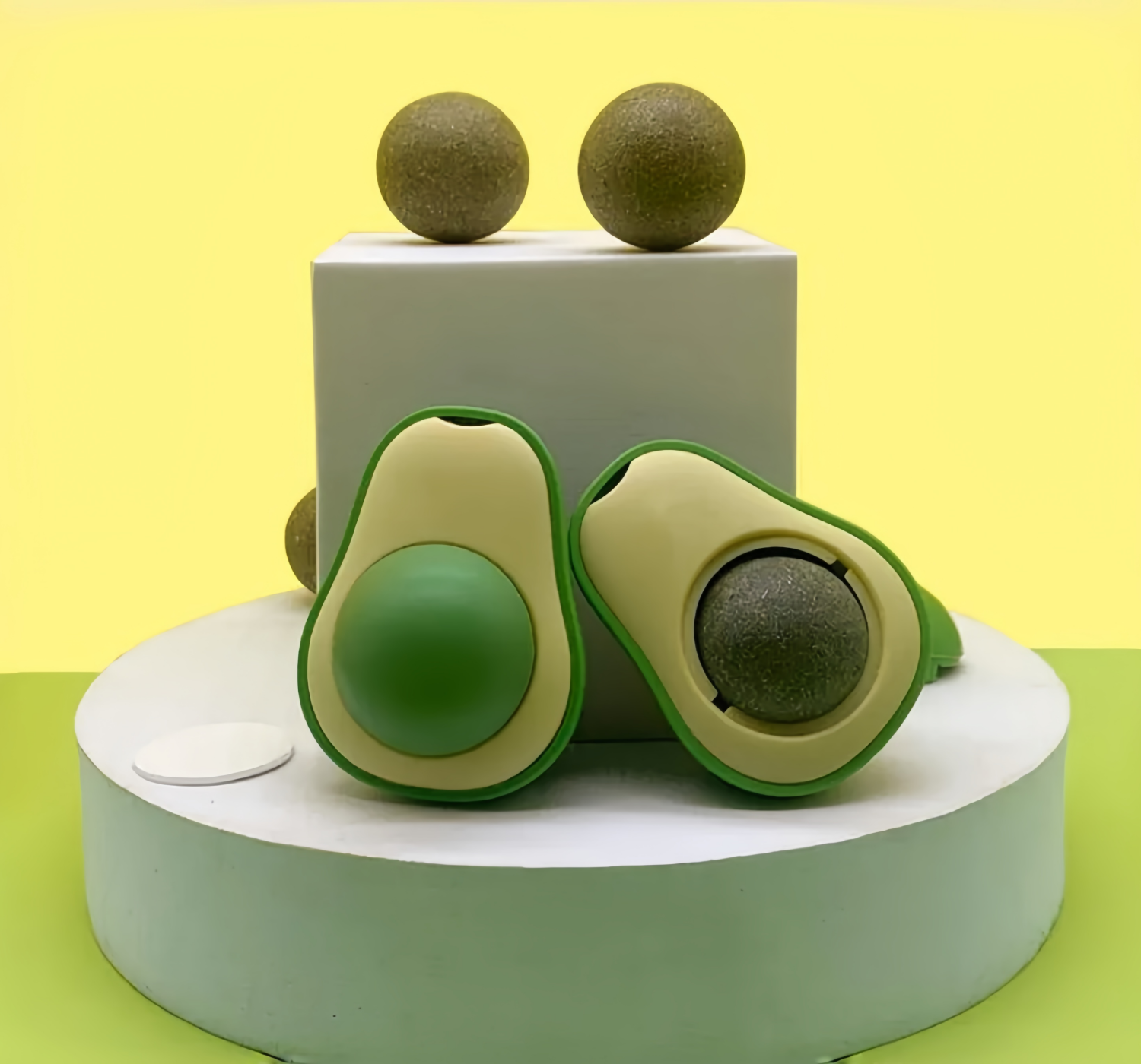 - Catnip, silvervine (gall nuts), food-safe resin housing, adhesive base