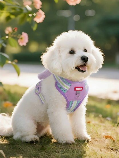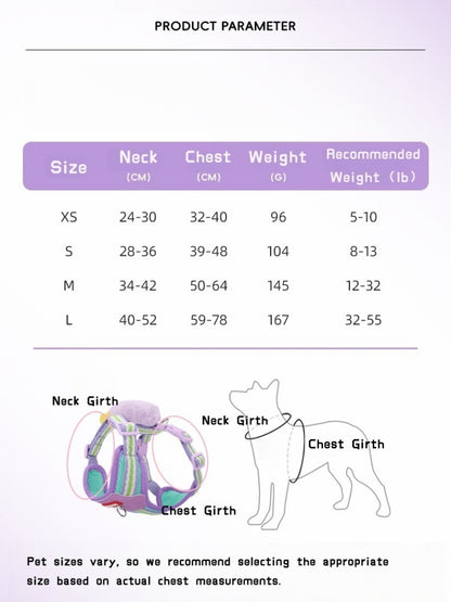 Breathability: Mesh + perforations for summer walksLeash: Coordinated pattern; standard length (spec varies by batch)Fit Guidance: Choose by actual chest girth; allow a two-finger gap; hand-made sizing may vary slightlyBest For: Toy/small breeds (e.g., Teddy/Poodle, Bichon, small mixed breeds)Care: Spot clean or hand wash cold; air dry flat; avoid soaking the plush accent