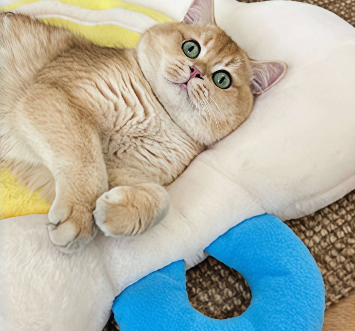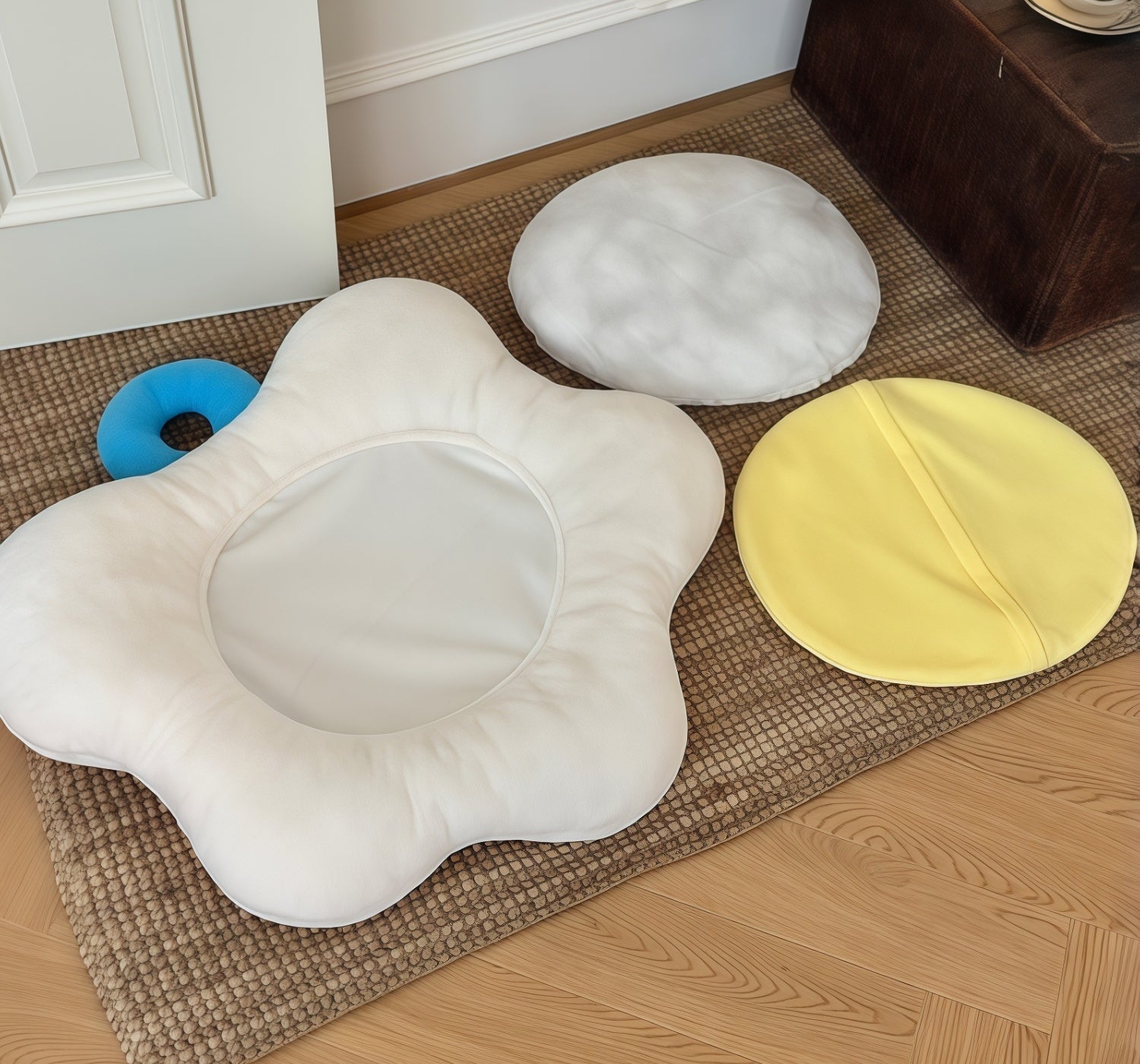 Vacuum and spot-clean daily; remove the yolk liner for a deeper refresh; hand wash and air-dry. Lightweight and portable, it doubles as a cute sofa/floor cushion—one mat that delights pets and owners alike.