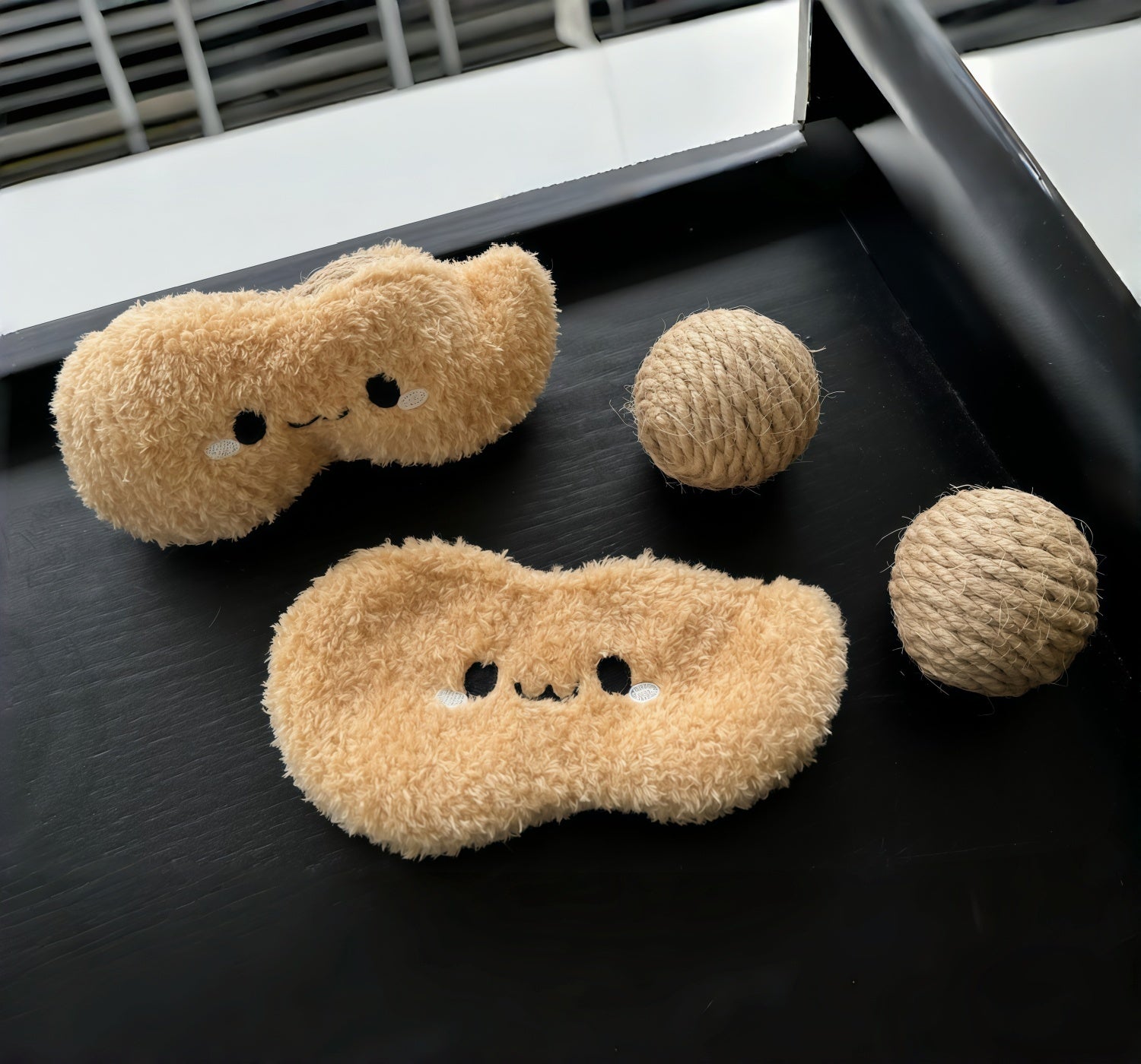 Plush peanut shell stores both balls—no more missing toys under the sofa.