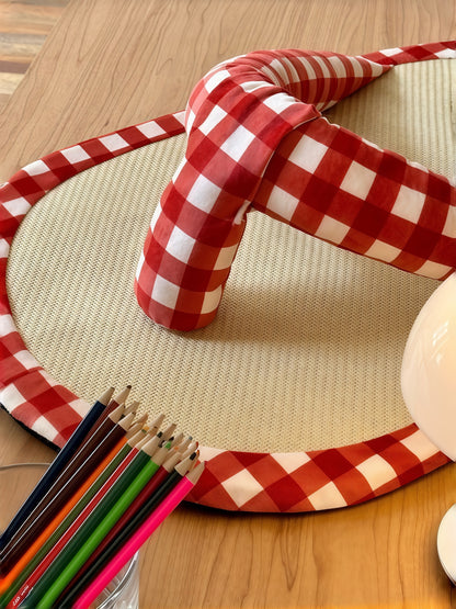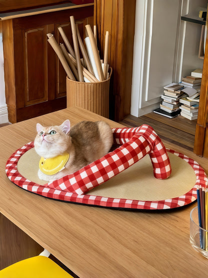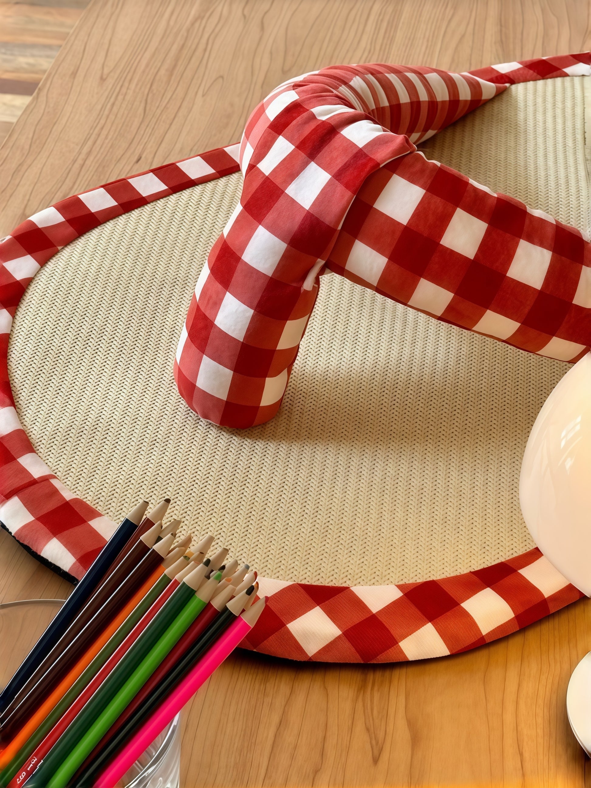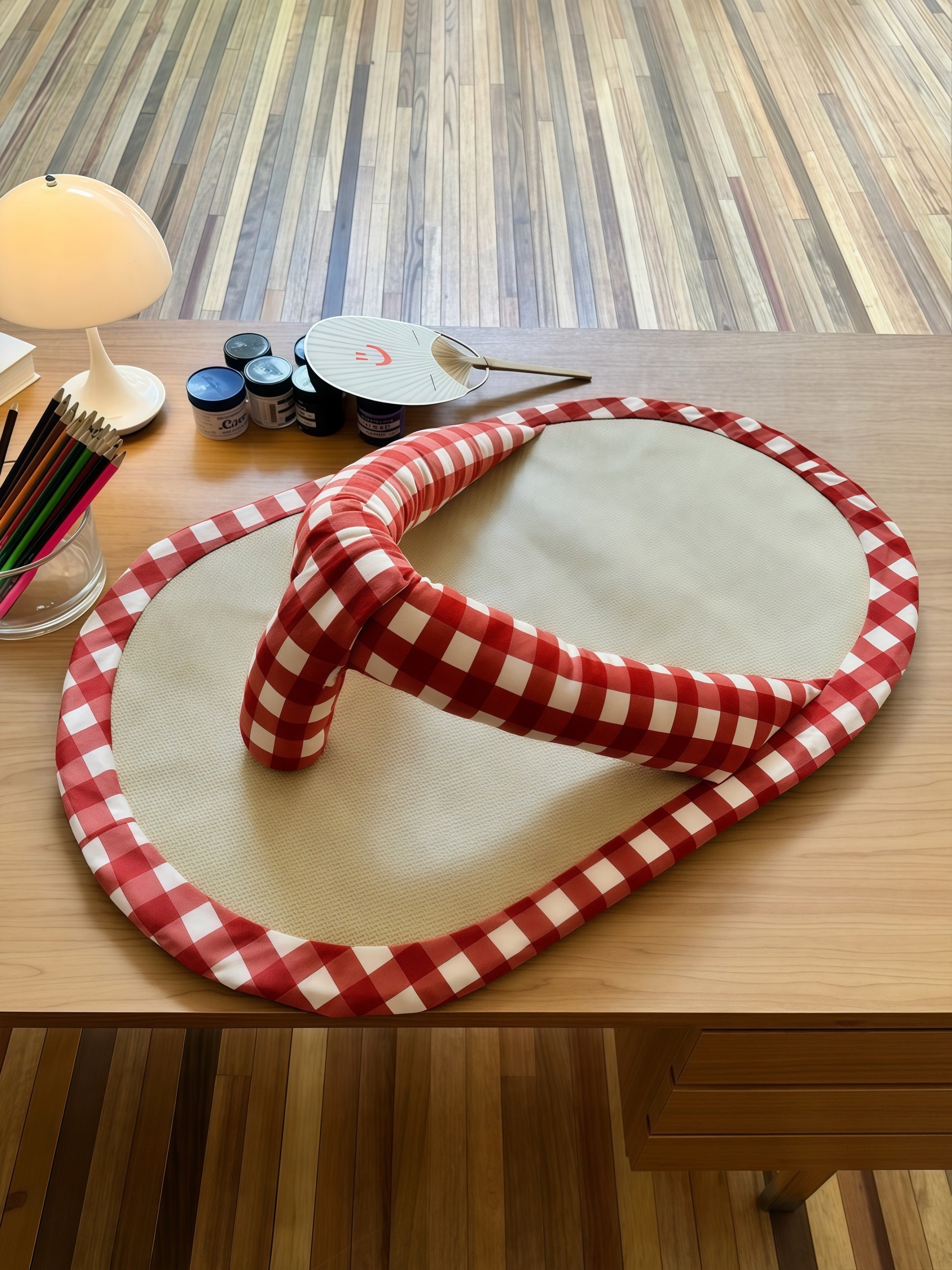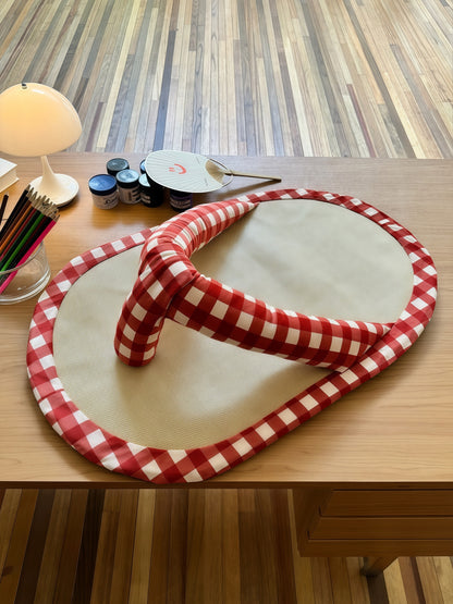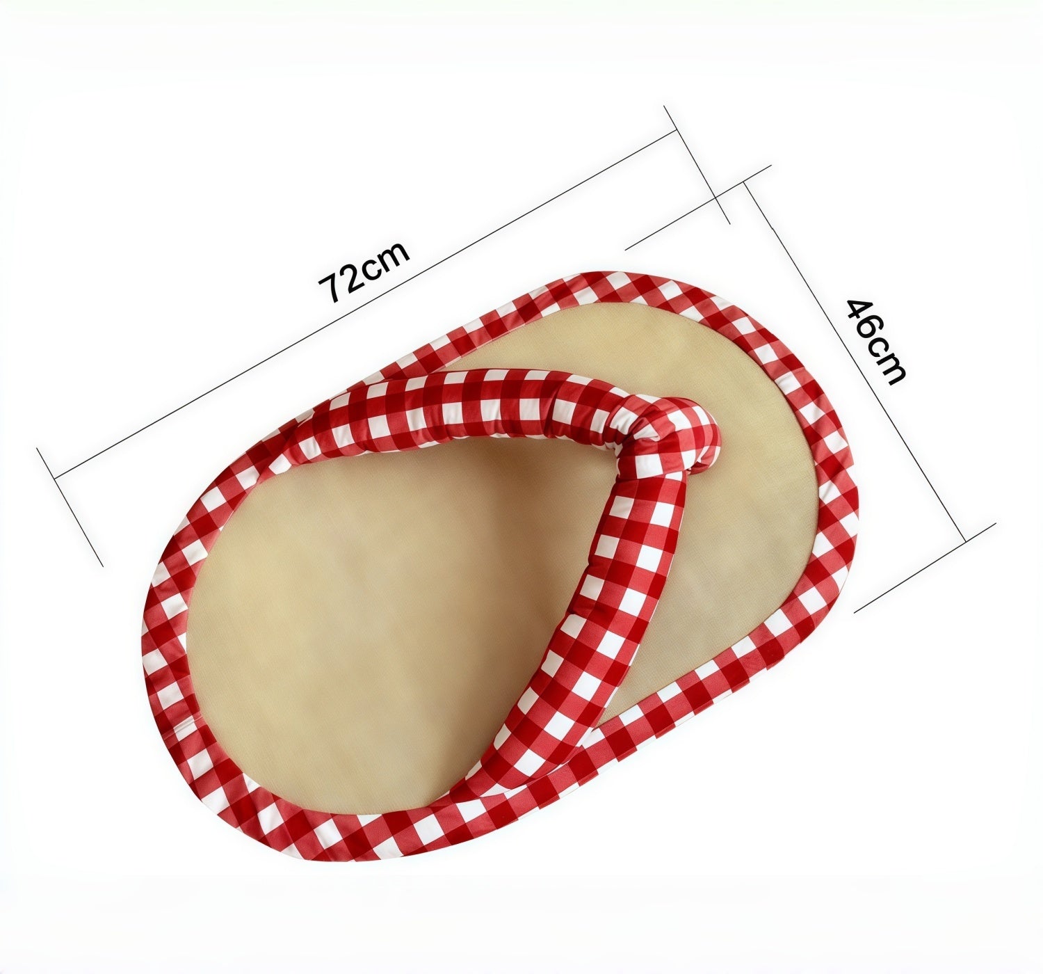 An anti-slip fabric base helps prevent creeping on tile or wood floors, and the playful red-check “slipper” silhouette doubles as cheerful décor. Perfect for sofas, bedsides, or travel crates.