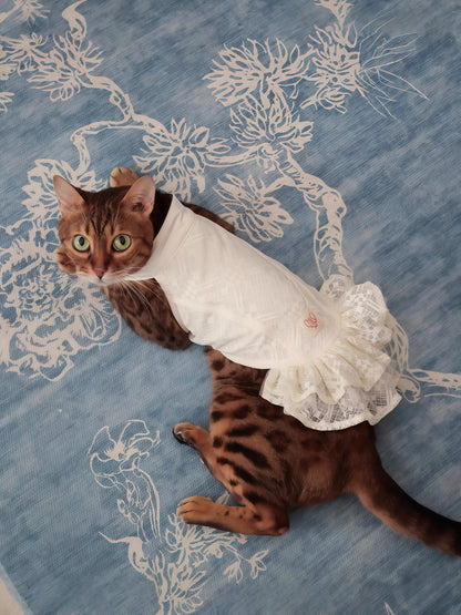 - Avoid sharp harness clips rubbing lace; use a soft harness over the bodice if leashing from the back.