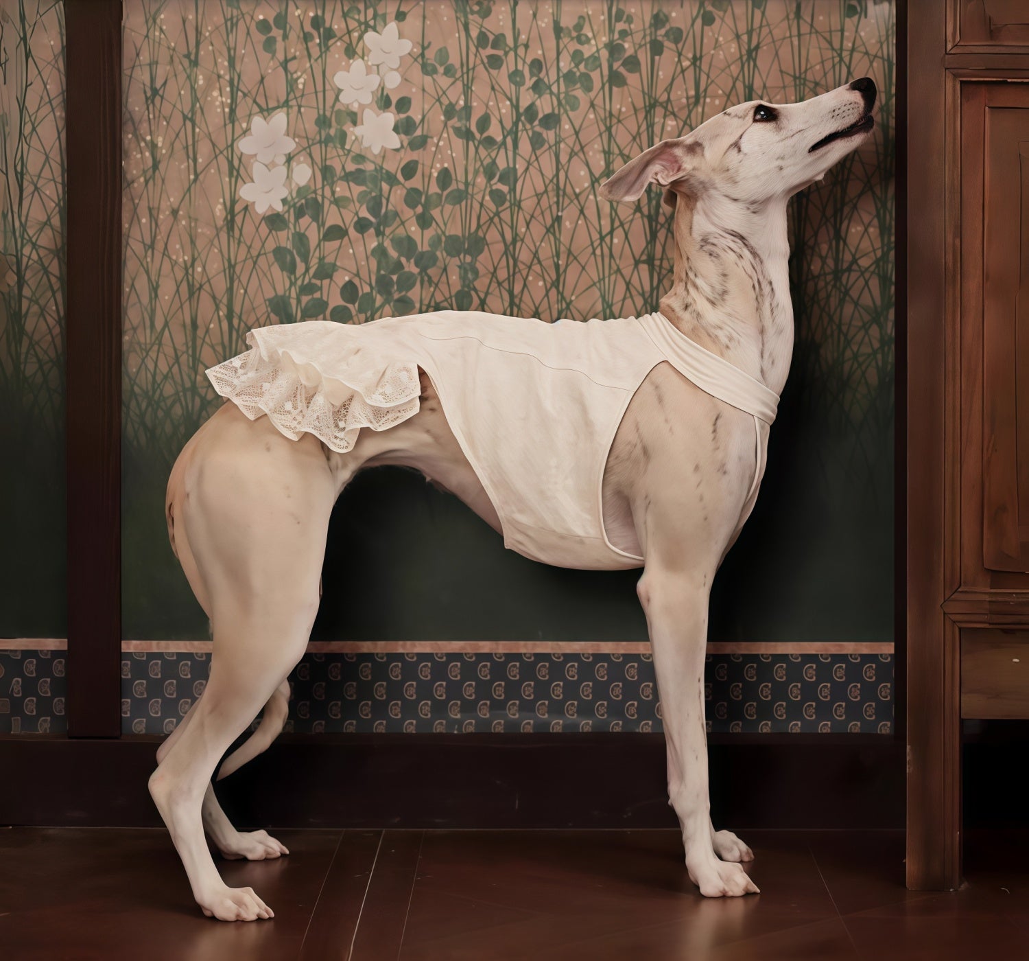 A contoured bodice and subtle “boning” lines define the waist without bulk, suiting Italian Greyhound and Whippet frames while allowing natural stride.