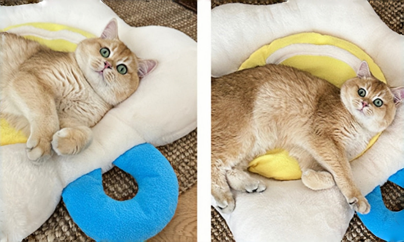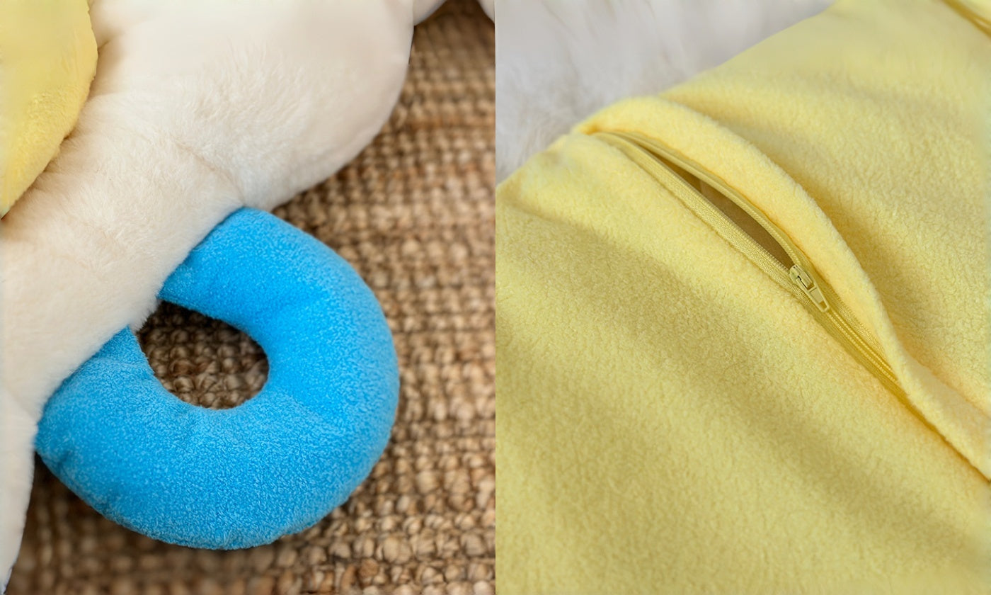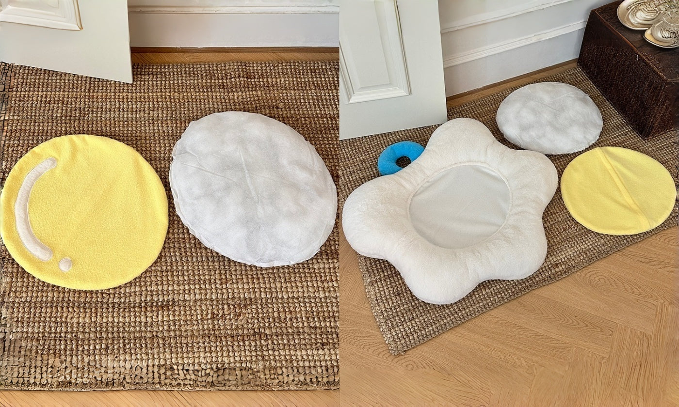 Vacuum and spot-clean daily; remove the yolk liner for a deeper refresh; hand wash and air-dry. Lightweight and portable, it doubles as a cute sofa/floor cushion—one mat that delights pets and owners alike.