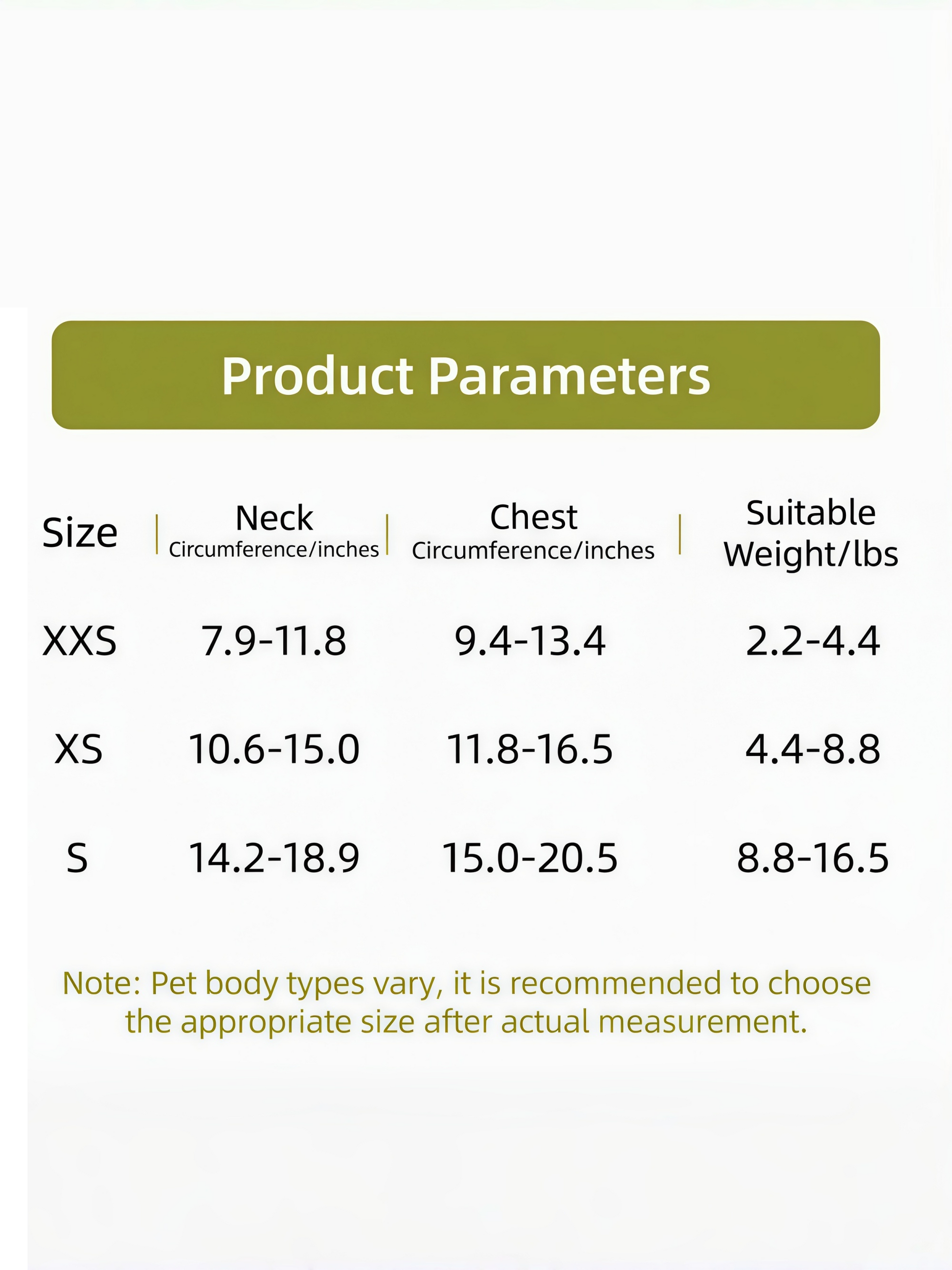 - XXS: 7.9–11.8 in / 9.4–13.4 in / 2.2–4.4 lb