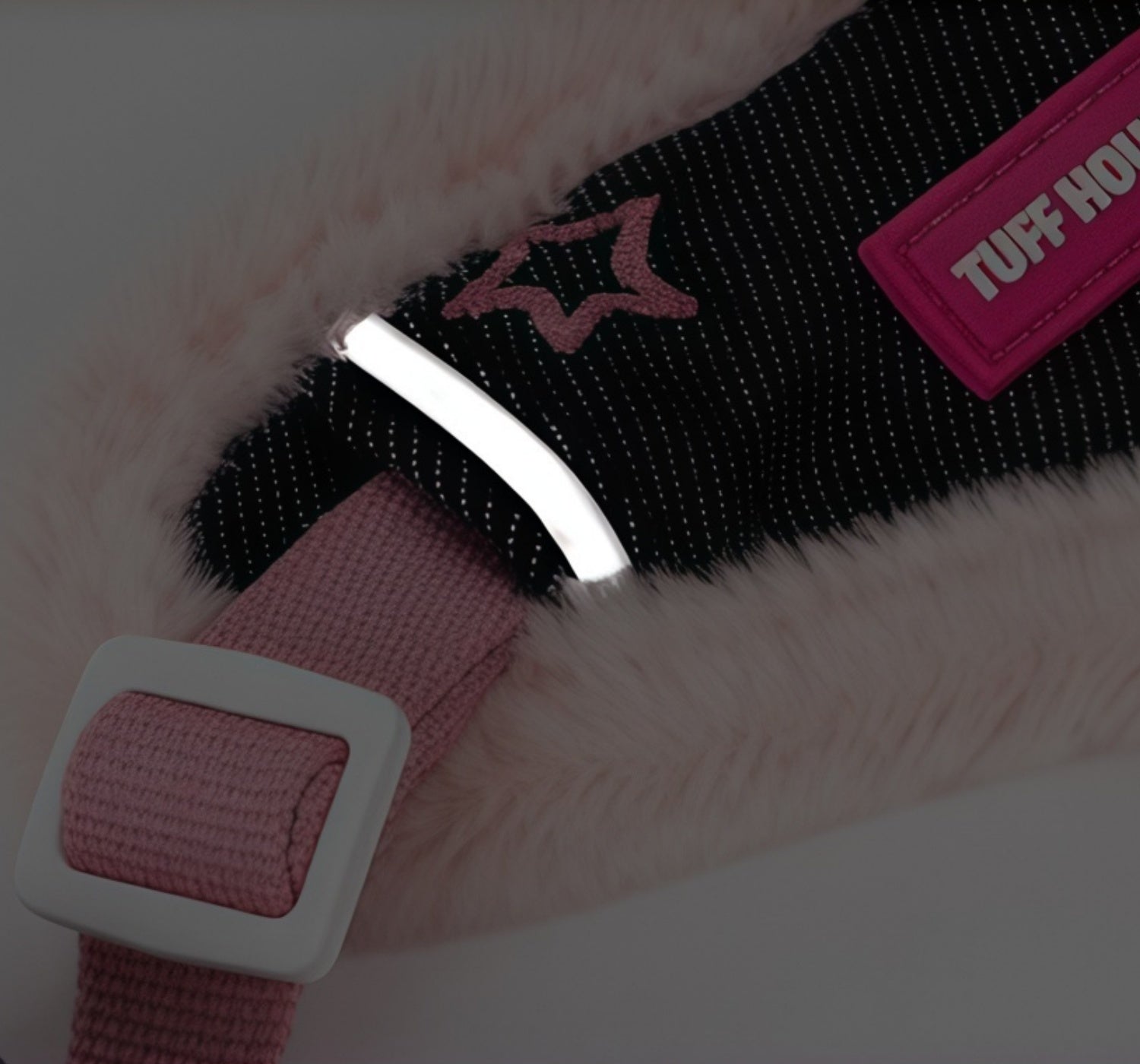 - Harness: washed denim, soft fleece (faux-fur feel), aluminum D-ring, reflective trim